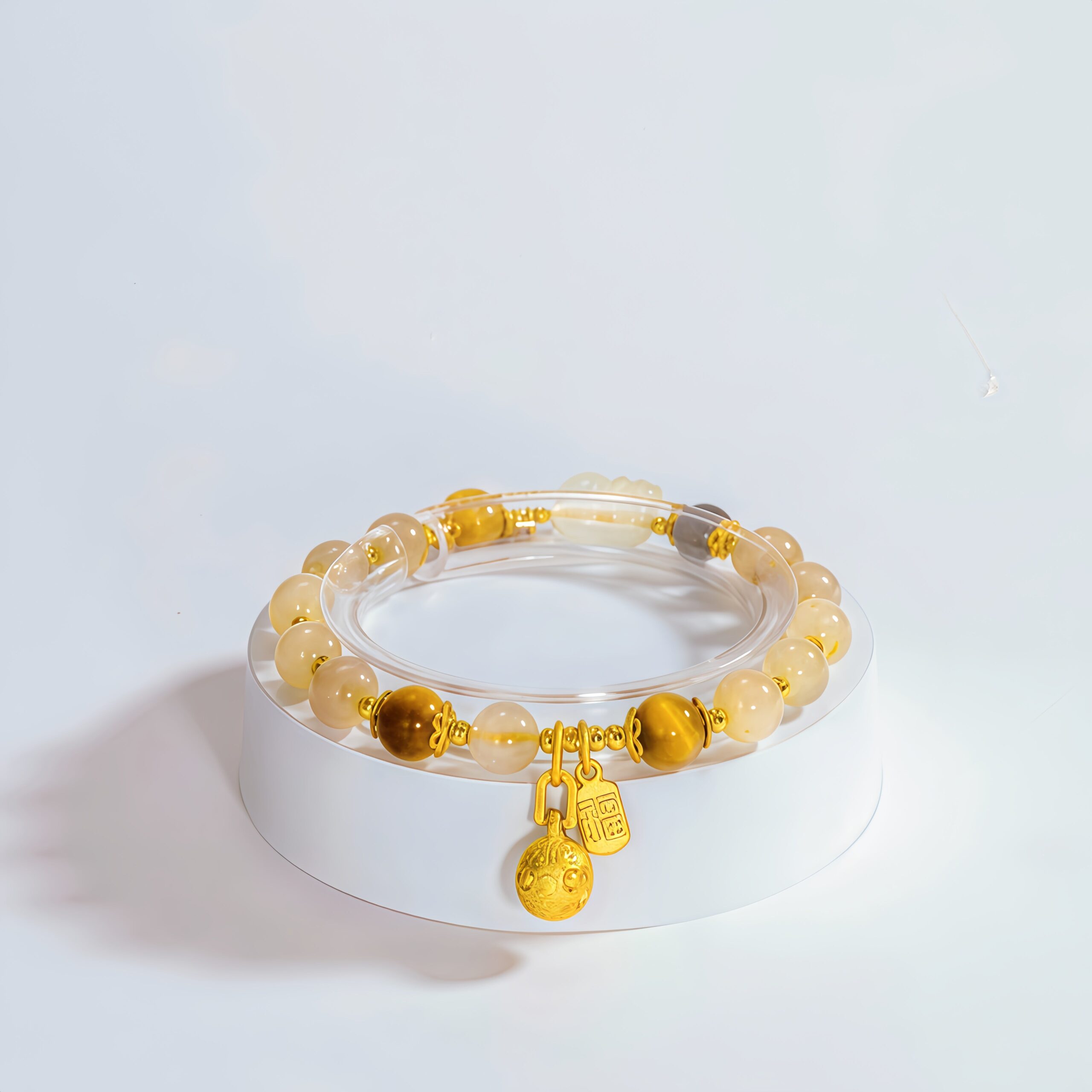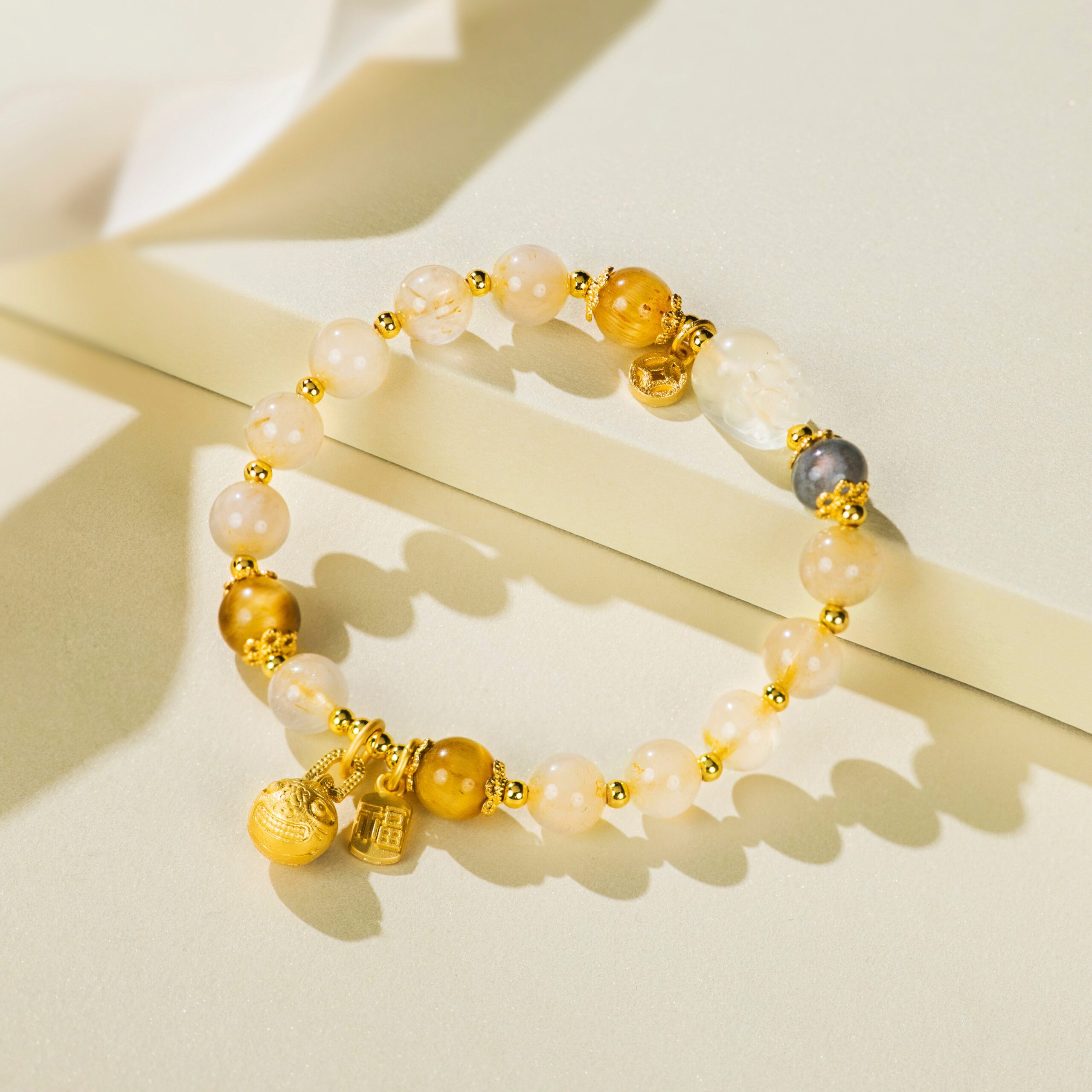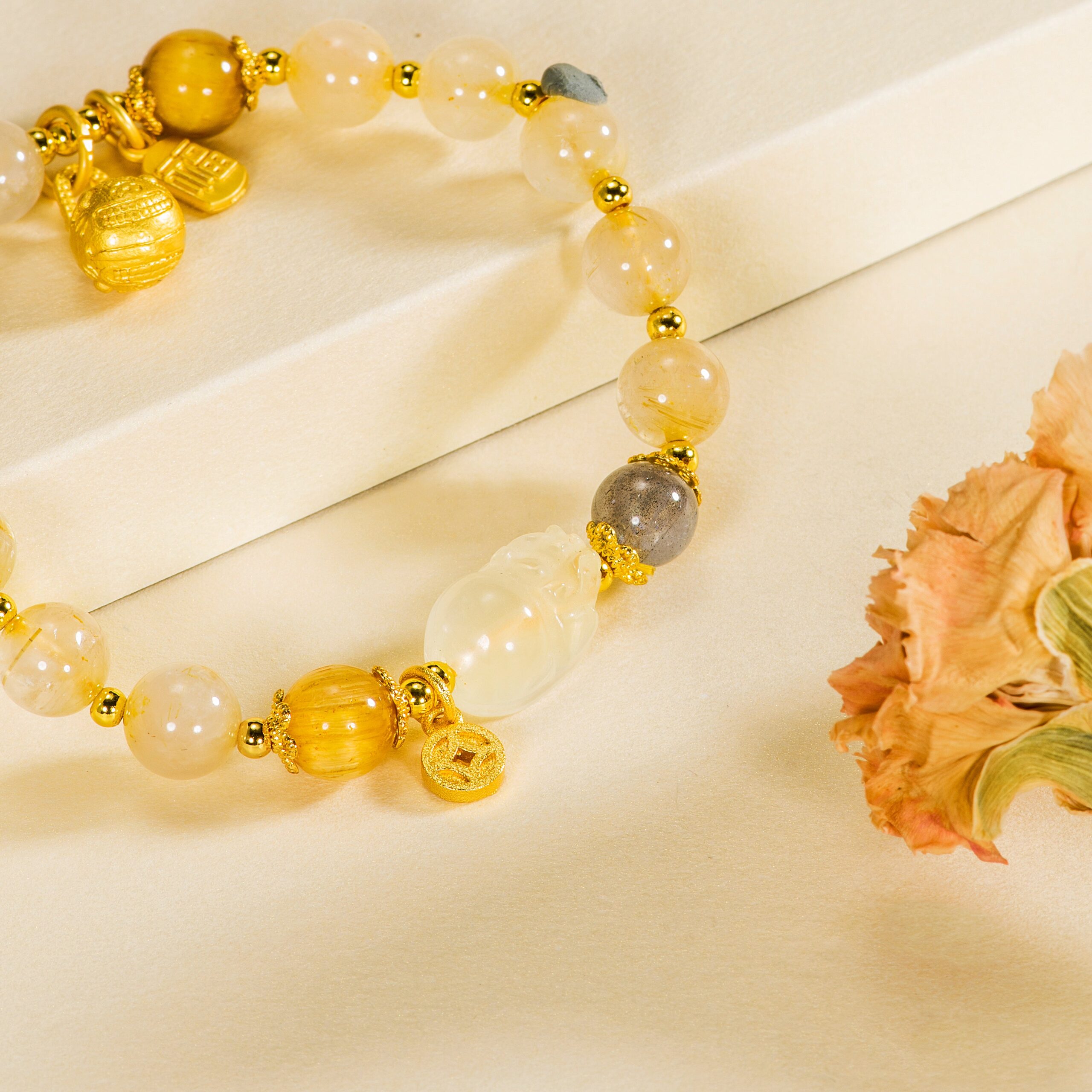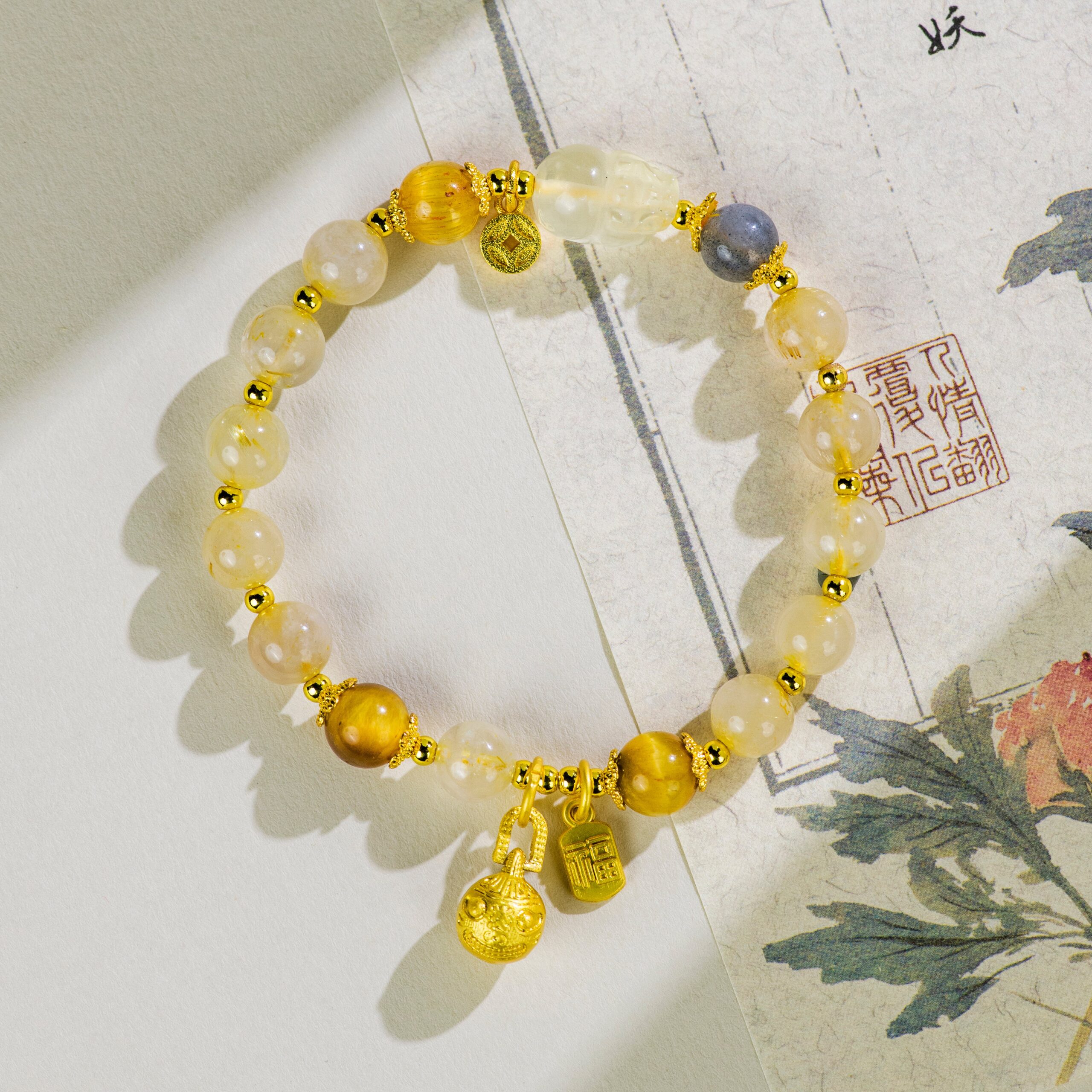 Premium Rutilated Quartz with fine golden needles. Paired with a meticulously carved mythical beast, it exudes status and refined taste.
